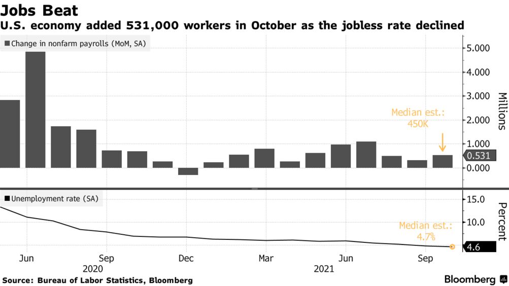 Us Jobs Report October 2021 531 000 Jobs Added Unemployment Rate Drops To 4 6 Bloomberg